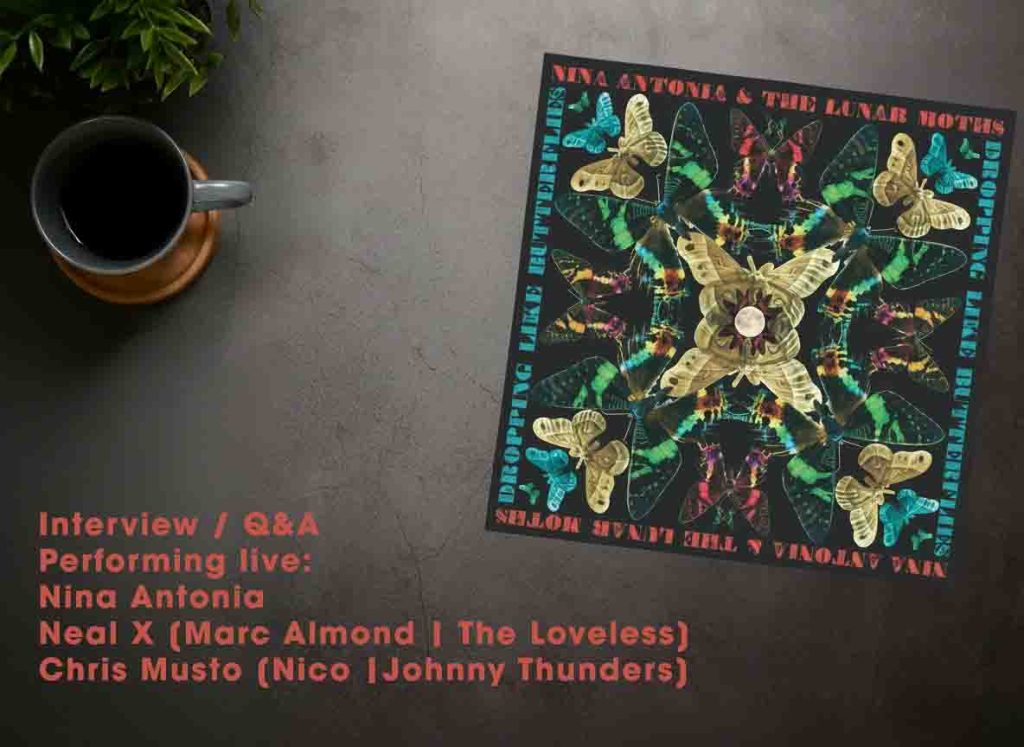 Nina Antonia is a published author on rock ‘n’ roll artists and wrote the biography of Johnny Thunders, In Cold Blood. She has also published novels and poems and writes for UK music and mystery publications. Dropping Like Butterflies is an album of her poetry spoken in her beautiful and atmospheric voice over glimmering rock ’n’ roll written and performed by friends including Neal X [Marc Almond], Mike Scott, Chris Musto, Waterboys‘ keyboardist James Hallawell and L.A’s finest Theremin wizard Armen Ra.